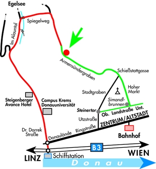 Falls Sie die rot markierte Route fahren möchten, müssen Sie bei map24 als Zwischenstation die Adresse "Rosenhügel, 3500 Krems" eingeben (siehe Bild unten).
